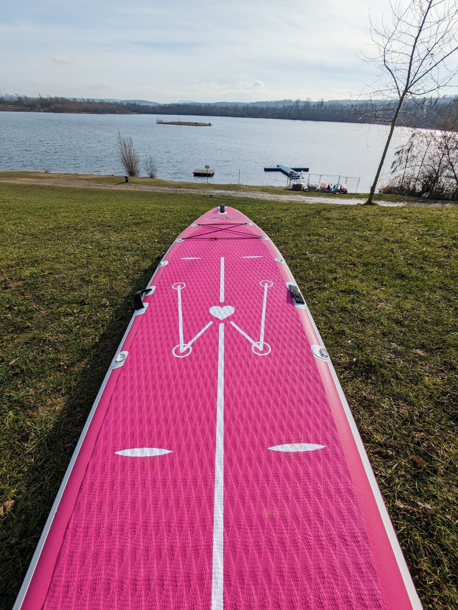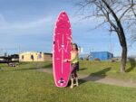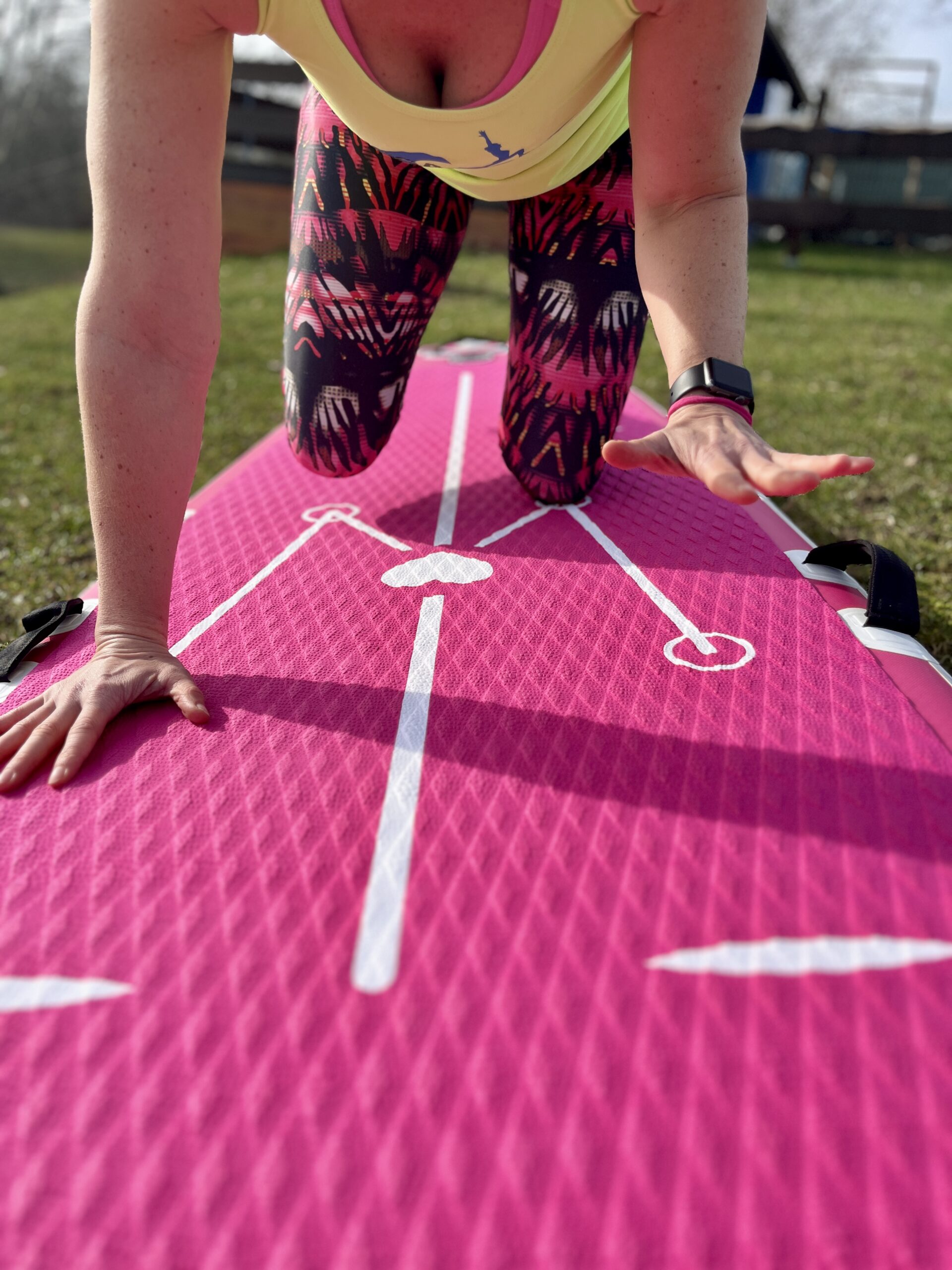 Durch neueste Drop Stitch Technologie ist es sehr leicht und steif und entspricht im Allgemeinen der Form eines klassischen Allround SUP Boards. Die Eigenschaften, durch es sich besonders für das SUP Yoga eignet, haben wir zusammen mit Julia Klesse von der WOGA Yoga SUP Academy heraus gearbeitet. Da eine Mittelgriffschlaufe bei vielen Yoga-Positionen stört, haben wir diesen durch zwei seitliche Griffschlaufen ersetzt. Die auch seitlich angebrachten Metall D-Ringe eignen sich für das Befestigen des Paddels. Das rutschfeste Deckpad mit seiner Rautenstruktur gewährleistet einen stabilen Stand in jeder Yoga-Position. Um die zu finden findest du auf dem deck pad die S.A.L (Siren Alignment Lines), die in leuchtendem Weiß auf dem ansonsten pinken Board angebracht sind. Diese Markierungen helfen dabei, die optimale Position für effektives Training zu finden.